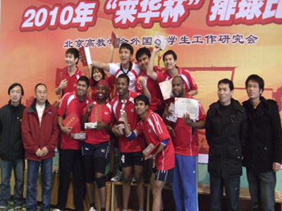 此次比赛,留学生处组织来自汉语学院、汉语进修学院、人文学院、速成学院的留学生组成北语队,并在体育部的大力支持下,成立了以刘英、赵强和刘坤三位老师为指导的教练组,经过近一个月的努力,终于夺得本届“来华杯”排球赛亚军,为我校争得了荣誉。