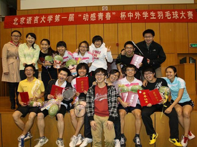 11月12日,首届“动感青春杯”中外学生羽毛球大赛在逸夫体育馆顺利闭幕。左不凡(泰国,研究生院)获得男子单打冠军,唐叶(中国,研究生院)获得女子单打冠军,叶宝福、陈梓楠(泰国,汉语学院)获得男子双打冠军,汤翠怡、冯一凡(中国,亚欧语系)获得女子双打冠军,陈梓楠(泰国,汉语学院)、司松鹏(老挝,汉语学院)获得混合双打冠军。根据比赛积分,汉语学院代表队获得团体第一名,外国语学院英语系代表队获得团体第二名,汉语进修学院代表队与研究生院代表队并列第三名。
