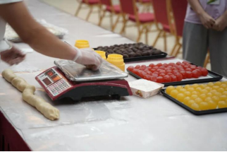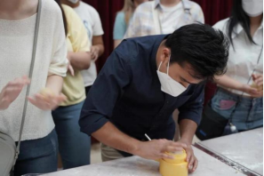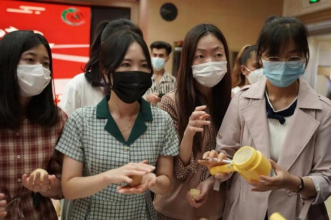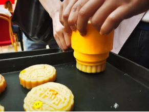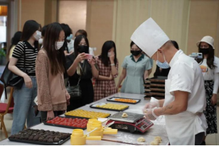 Later, with the guidance of the master chef, the international students got familiar with the procedure of making moon cake, and made the traditional Cantonese moon cake with the stuffing of egg yolk ,bean paste ,strawberry and pineapple by their own hands, participating and feeling the joy of it.
